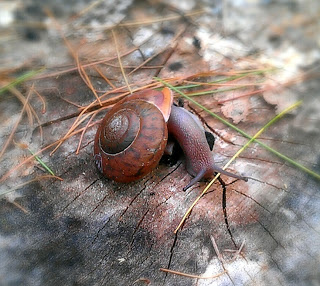 | A giant snail explores a log. |