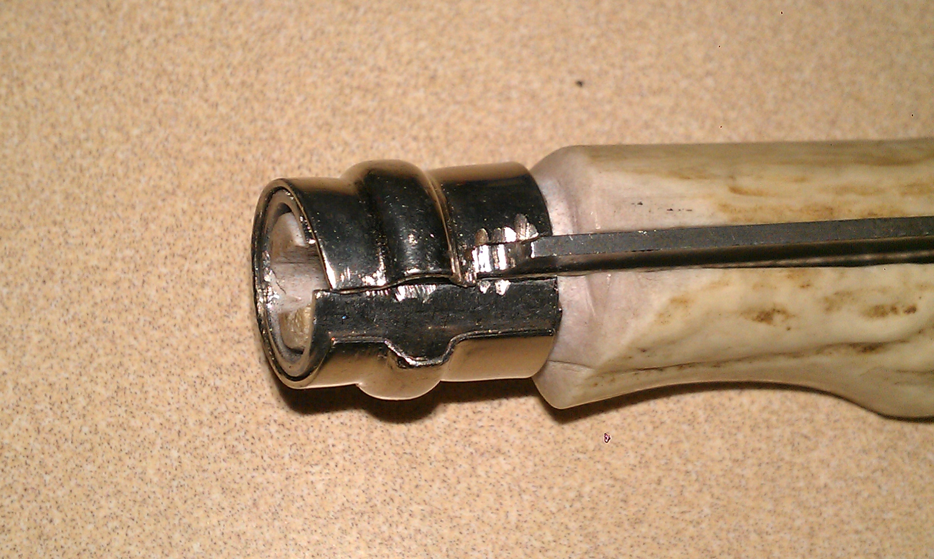 To remove the rest, you’ll need to cut off one end of the pin with a hacksaw or Dremel blade. After that, the pin can be tapped and pulled out. Now the blade can be removed and the inner metal band too. Do not deform the inner metal band. It will be your template for a new pin hole on the antler.