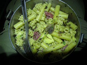Homemade cheesy pasta meal – I found this cheesy pasta meal on MSR’s blog and it sounded so delicious, I had to try it. But, when I raided my cabinets before a March 2017 hike, I learned I would need to substitute a few things. So I made my own version with home-dehydrated white mushrooms, dried parsley and purple basil from my garden, chunks of dry salami and cheddar cheese. It wasn’t quite like the photos in the blog, but it was still really good. And because it was using lunch stuff I already had, the weight of this meal was less than a pouch of stroganoff.