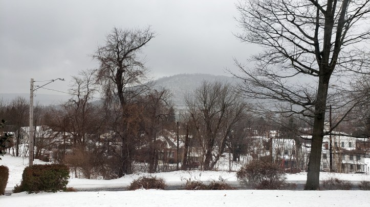 I’m waiting out a wind and sleet storm at home, on a hill, overlooking the Susquehanna River and the Kittatiny Ridges beyond it. The sleet clouds wash over the ridges like waves on a rocky coast, frothing, scouring.