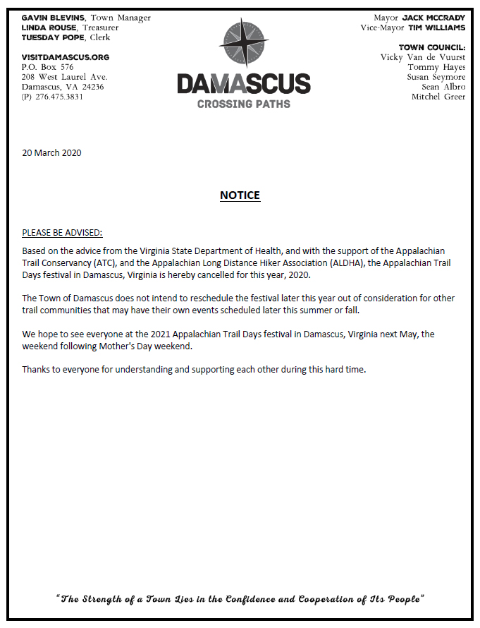 May 15-17 — Trail Days, Damascas, Va.: Trail Days was CANCELED on Friday on the advice of the Virginia Department of Health.